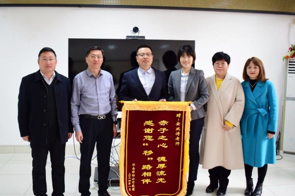 2月29日上午,济南市移动公司代表们来到best365官网中文版登录,将一面绣有“赤子之心 厚德流光,感谢您‘移’路相伴”的锦旗送到学院,以表达对best365官网中文版登录安延涛老师的感谢之情,学院党委书记程涛、副书记孙成政参加了捐赠仪式。