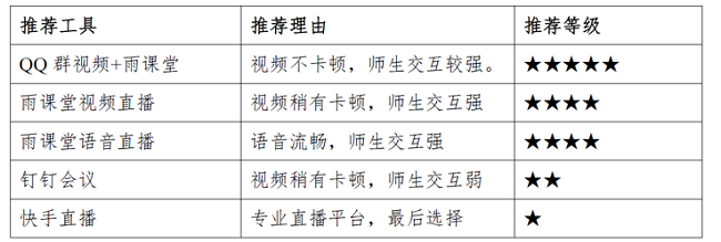 best365官网青年教师段德荣老师,在网络授课的方法和准备上投入了大量的精力和时间探索,他利用超星、雨课堂、腾讯课堂、腾讯会议等多种授课工具,多次测试了不同学生人数、不同时段,以及多工具相结合的授课方式。他制作的《网络教学基本操作规范》被济大教师发展中心在教师群内推广;近期他又为best365官网师生制作了《课前准备篇》,诙谐的把课堂资料比喻成“粮草”、授课平台和工具比喻成武器。为了让老师更好的应对网络卡顿等问题,他整整介绍了五套授课方案做备选,并比较了优劣,见表1。